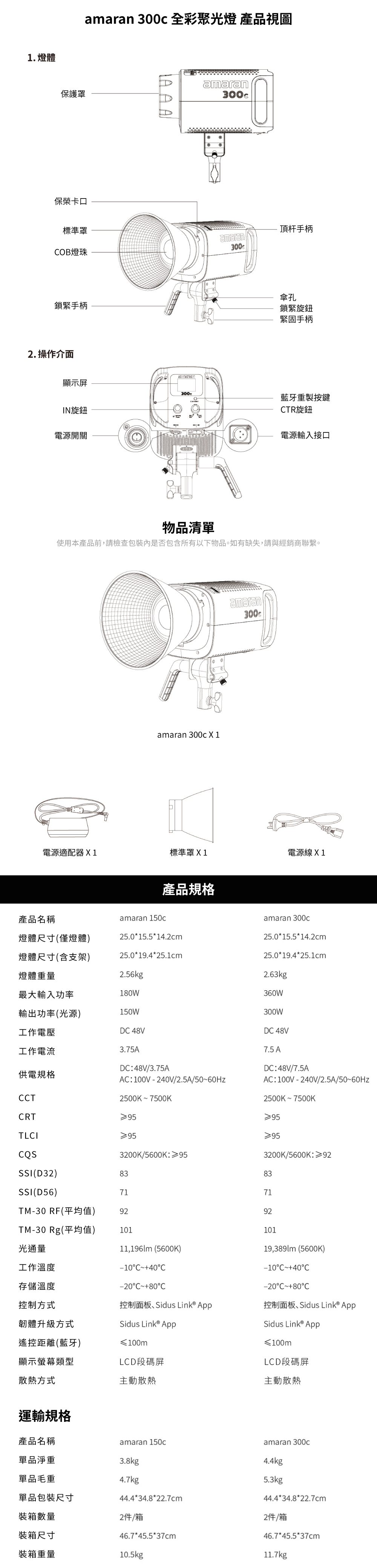 amaran 300c 1米處照度高達26,580Lux(5600K)