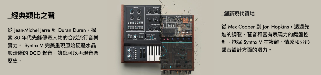 透過 Synthx V 無限創意的面板,將這個義大利傳奇的全景模擬魅力推向全新的聲音領域。
