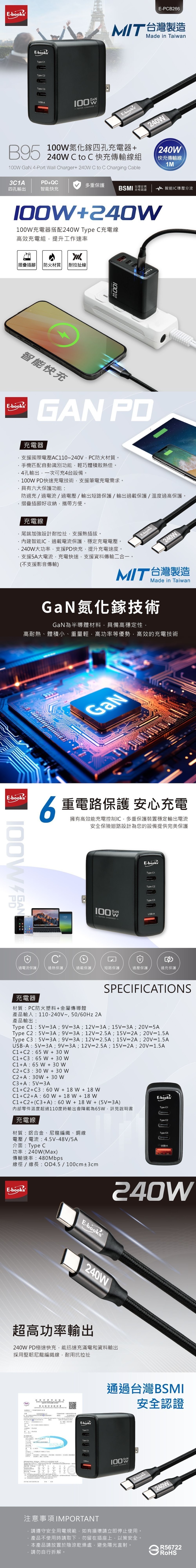 240W 大功率,支援 PD 快充,提升充電速度。