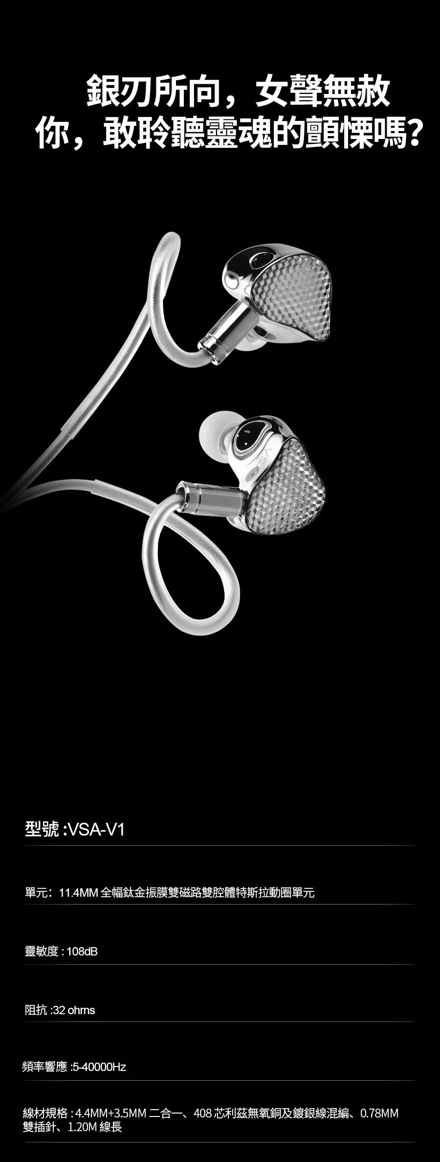 高階鍍銀線材:支援 4.4 mm 與 3.5 mm 插頭。