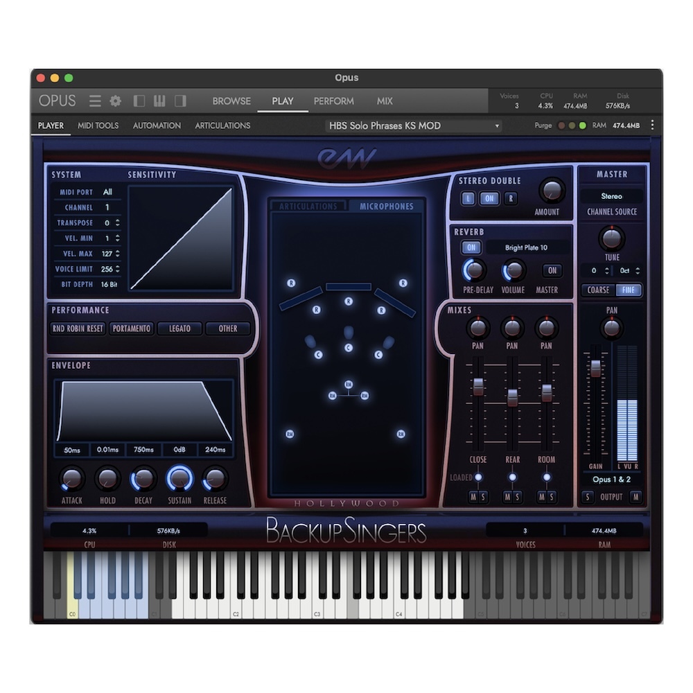 Hollywood Backup Singers 在 EastWest Studio Three 錄製,這個錄音室曾經錄製過 The Mamas and the Papas、Blondie、多莉 · 巴頓、蕾哈娜、Frank Ocean、Ariana Grande、Lady Gaga 等眾多藝人的作品。這個音色庫提供了三種麥克風混音選擇:近距離 (Neumann U47、Telefunken 251、Shure SM7)、後方 (立體聲 Neumann KU100 仿真人頭麥克風、一對復古 RCA 77 麥克風、一對 Sennheiser MKH800 麥克風) 和房間 (使用 Decca-Tree 配置的三支復古 Neumann M50 真空管電容麥克風和一對 Neumann U67 麥克風) 。