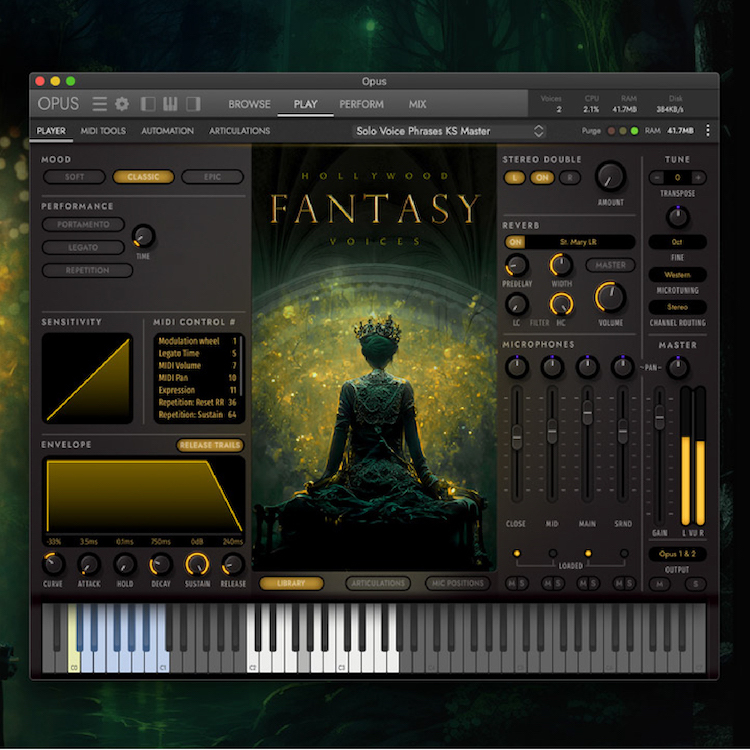 不需繁瑣的控制器自動化,只需長按單一音符,Merethe 迷人的聲音將完成其餘部分!切換 Lyrical (用於戲劇性、動感的元音) 和 Vibrato (用於高能量的持續音元音),立即為您的樂譜添加神秘、莊嚴的主旋律 (想像霍華德·肖爾的《雙子星之歌》)。每一個音符都充滿情感和魔力,隨時可添加到您的奇幻樂隊中。