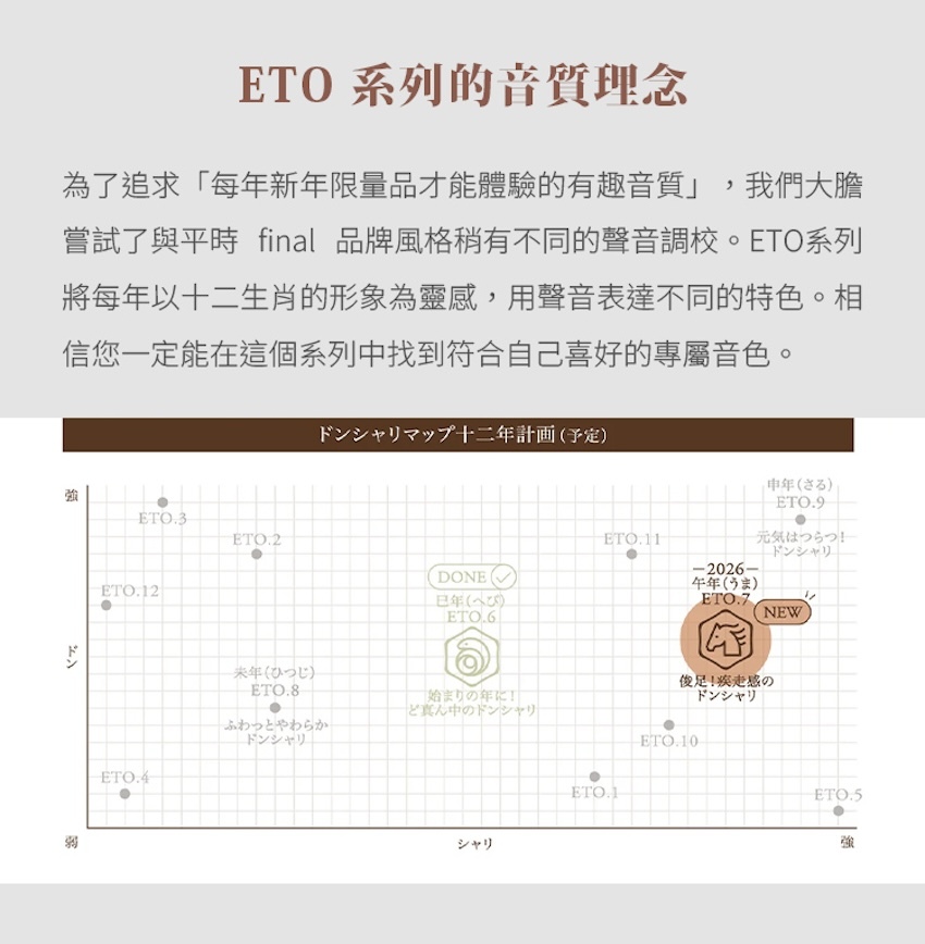 ETO 系列的核心精神在於:透過每年不同調音風格的限定耳機,讓使用者體驗多變而精彩的聲音世界。