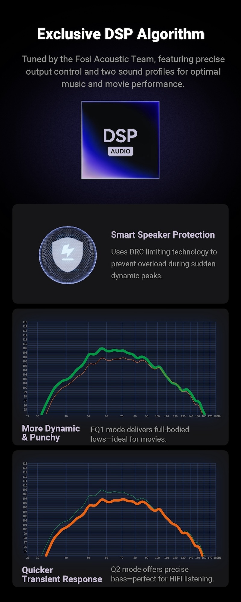 智慧 DSP、雙 EQ 模式、自動電源感應