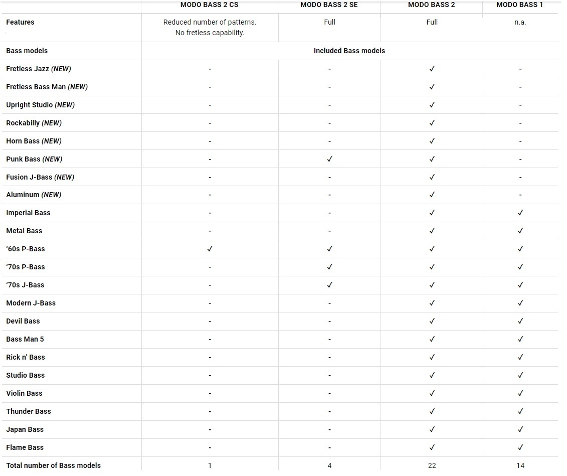 MODO BASS 2 增加了 8 款新貝斯,包括新的 fretless 貝斯和直立式低音提琴選項、帶有大量新律動的新模式、先進的性能控制和更多進入 MODO BASS 世界的方式。