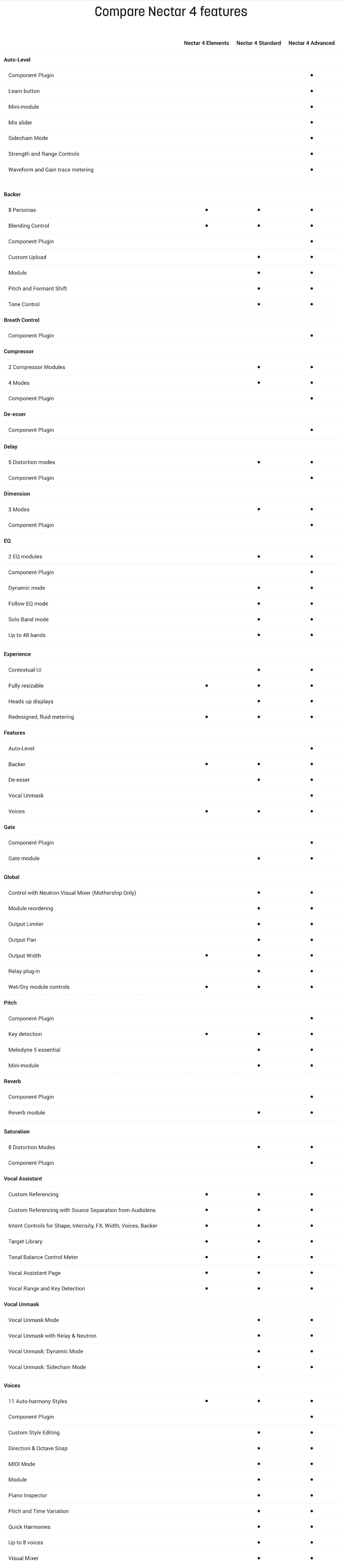 • 內附 Melodyne essential 與大量專業預設 ( Nectar 4 Element 版本則不包含 )