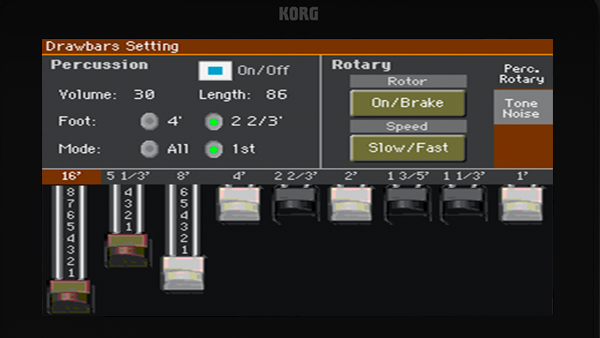 有著數位滑桿的管風琴包括有琴鍵的開/關噪聲,仿真的旋轉喇叭效果。