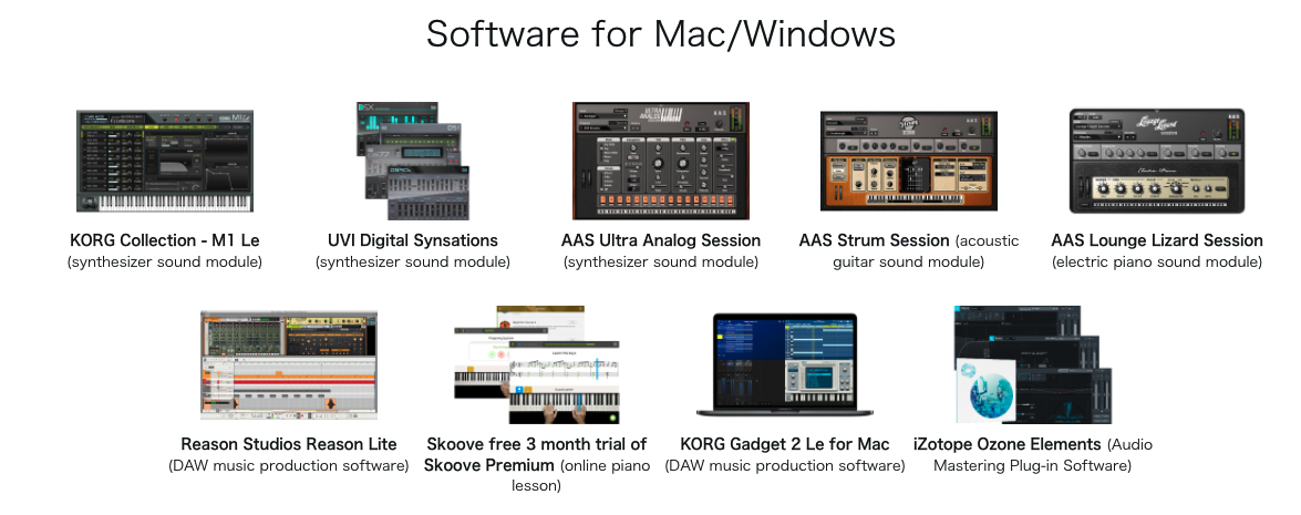 、可以幫助您提高鍵盤演奏技巧的“Skoove”、“Reason Lite” DAW 軟體,以及來自 KORG 和其他品牌的軟體合成器。