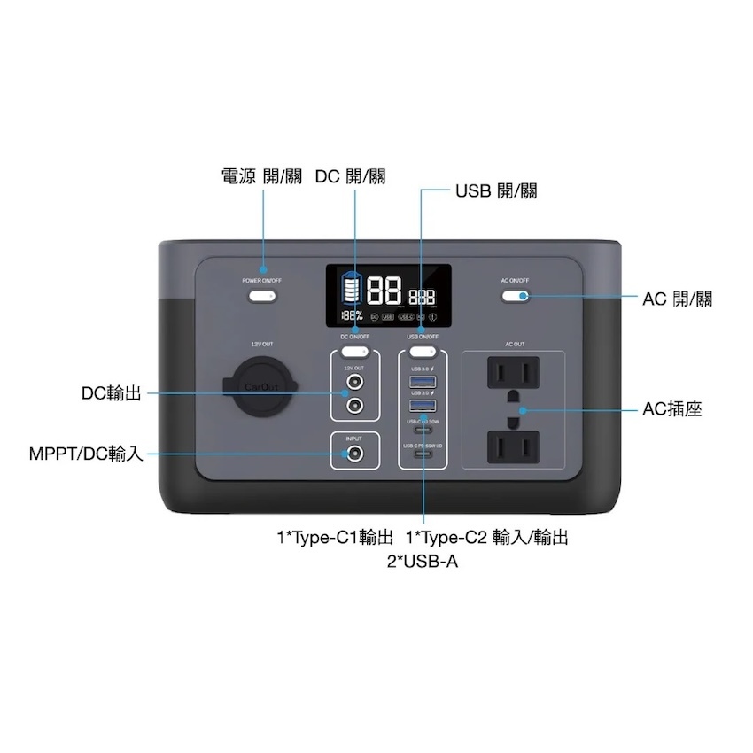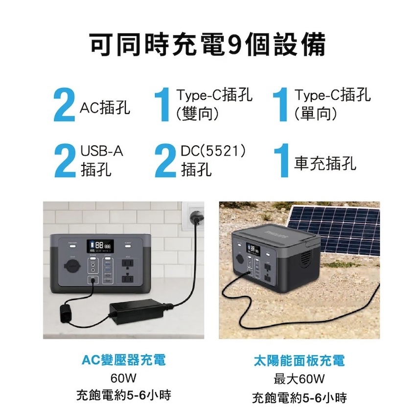 支援 AC、市電與太陽能充電