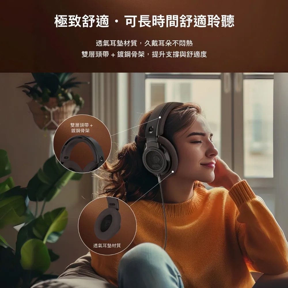 搭配開放式後背設計,打造寬廣自然的音場空間,呈現彷若現場演奏的臨場感