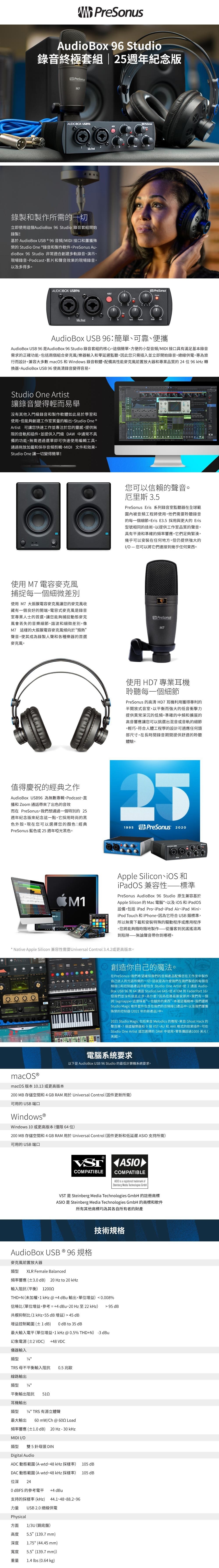PreSonus AudioBox USB 96 錄音介面,具備 USB 音訊 / MIDI 連接功能,內附 USB 連接線