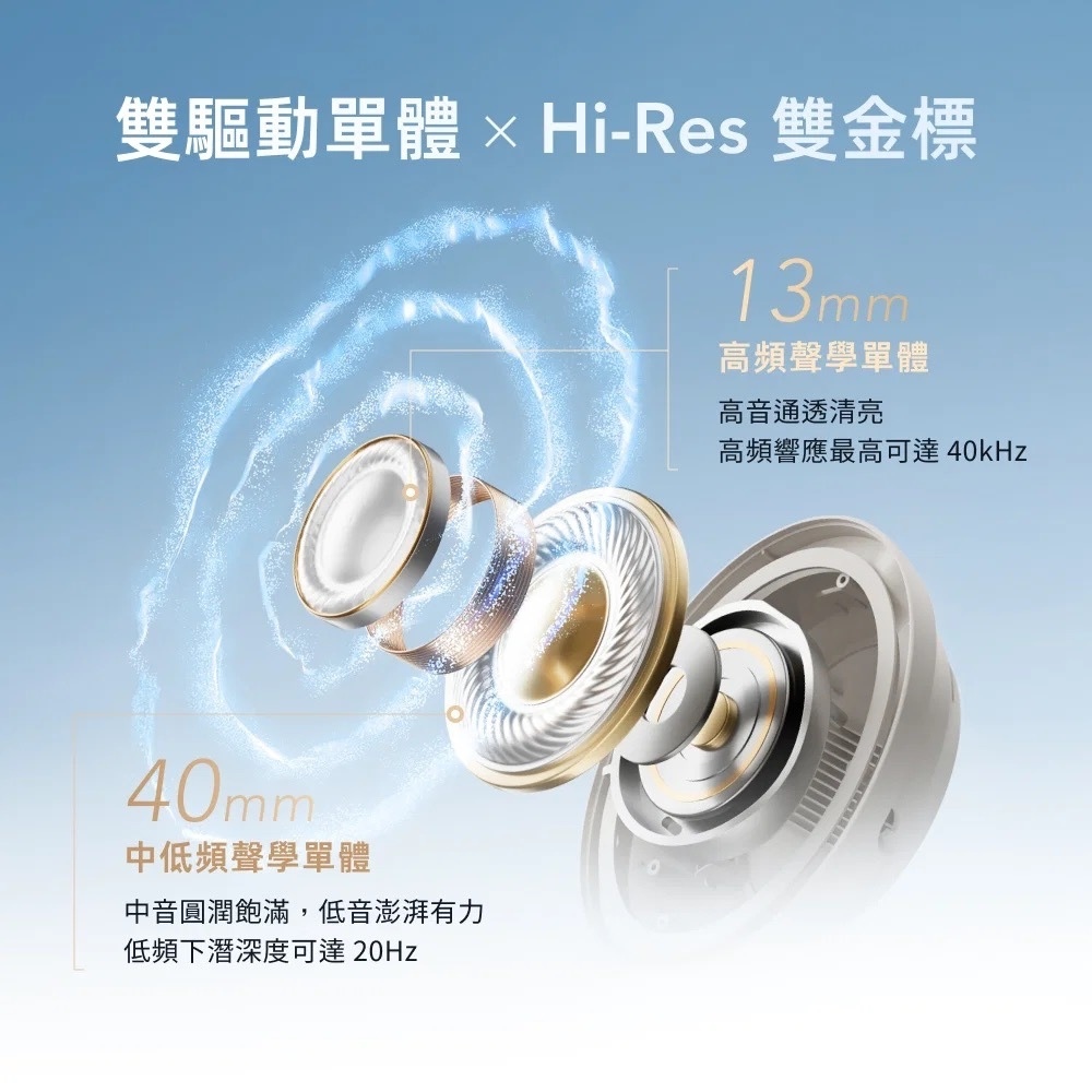 40mm 厚實低頻 × 13mm 透亮高頻