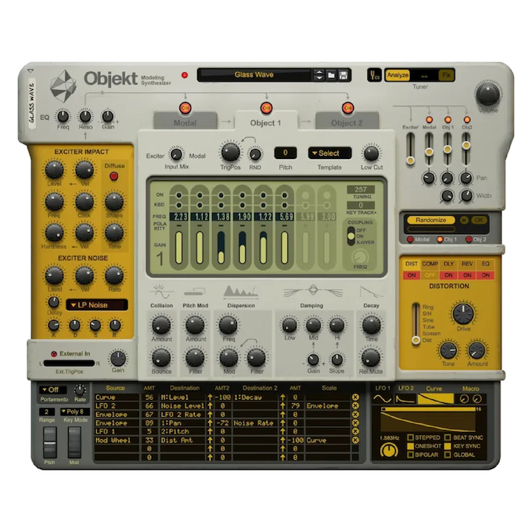 Objekt 模擬了聲學樂器的特性,並允許您將這些特性作為參數進行控制。與選擇預製選項不同,它打開了物理建模合成的內部運作,以便您可以進行實驗,並將其視為真正的合成器。