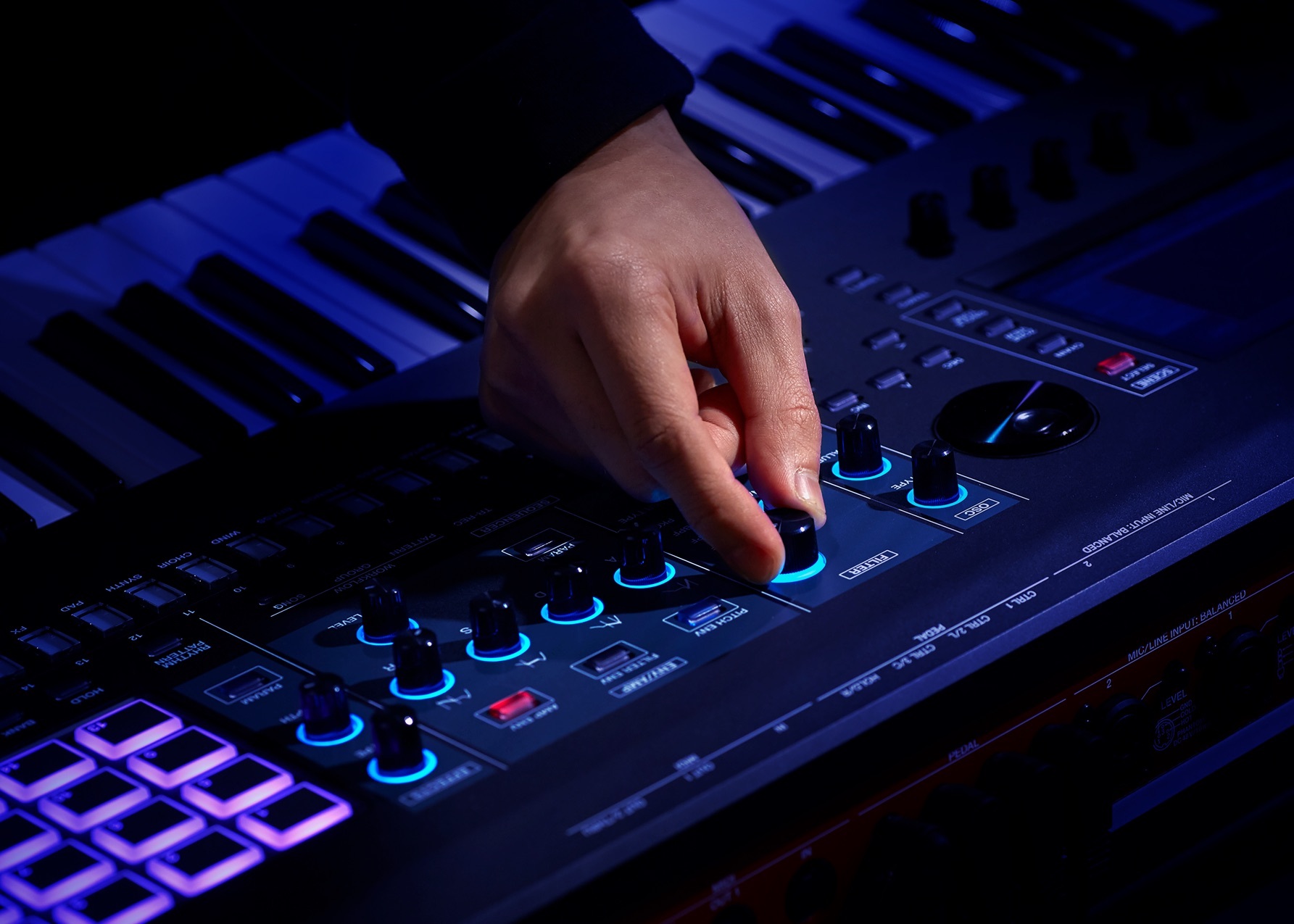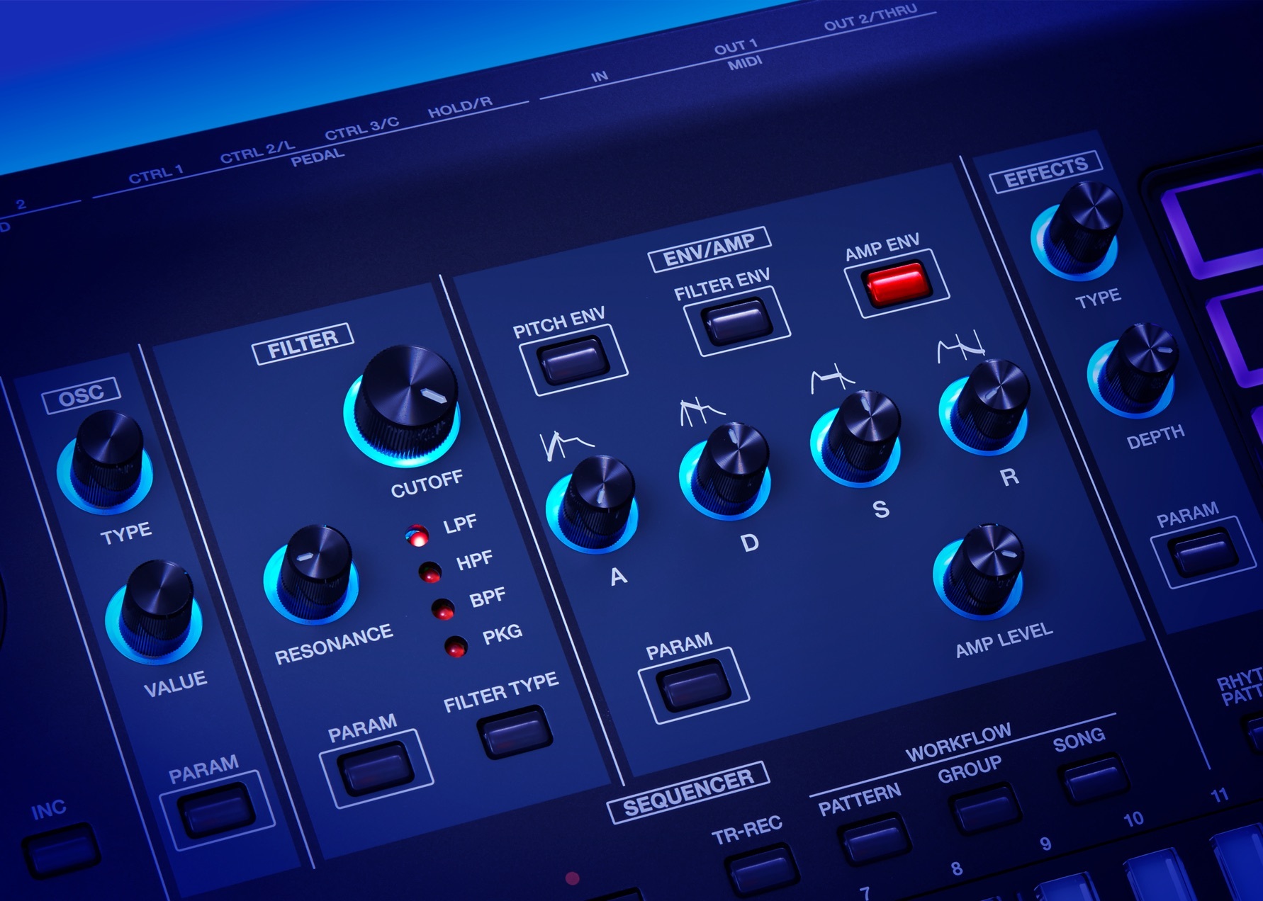 有一個專屬的合成器區,配備振盪器、濾波器,以及波封控制,還有眾多按鍵和用於觸發和編輯的壓鍵。