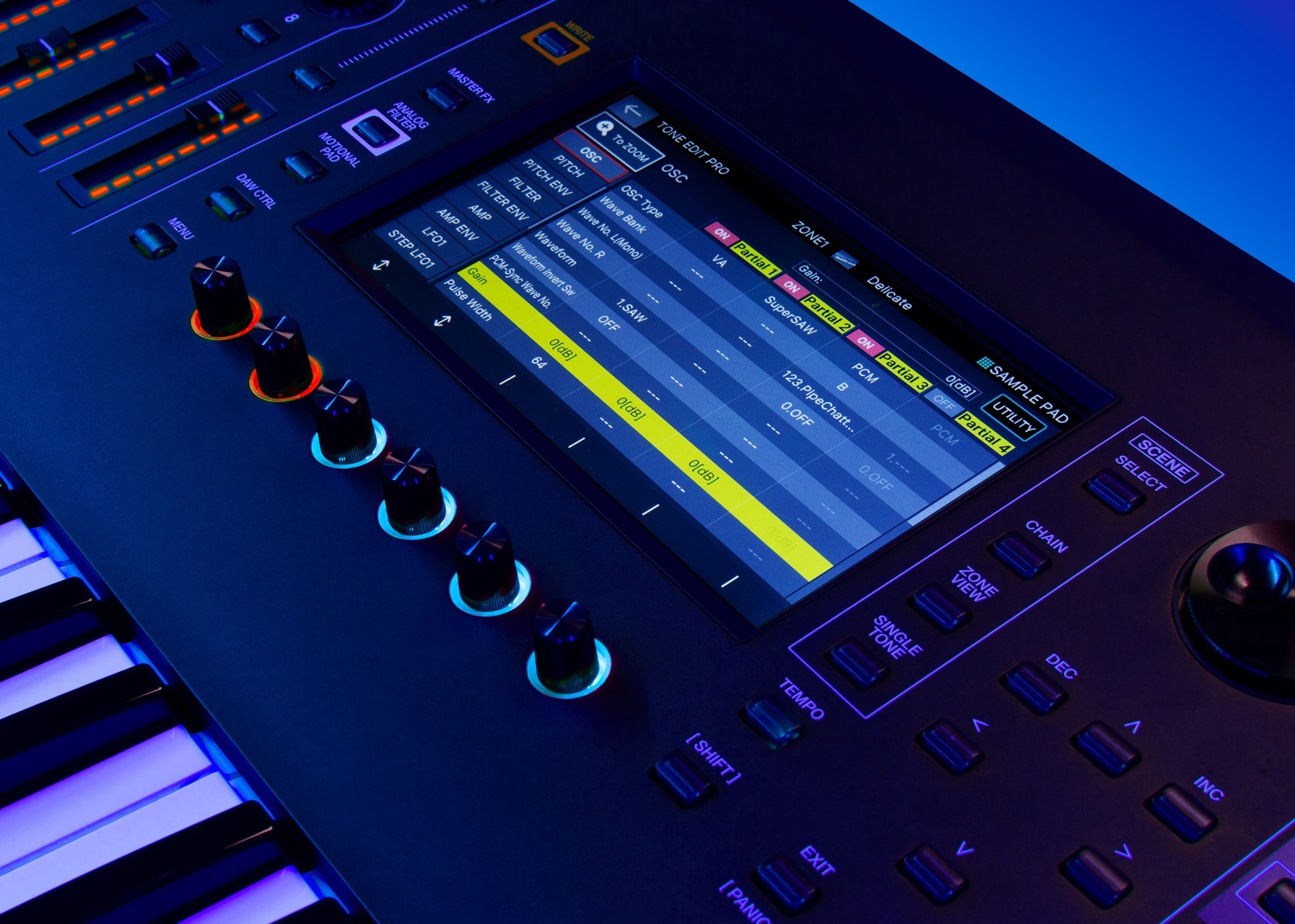兩個LFO和效果器組合。一個單一音色最多可使用四個partial,一個Scene場景可設置多達16種音色,可進行複雜