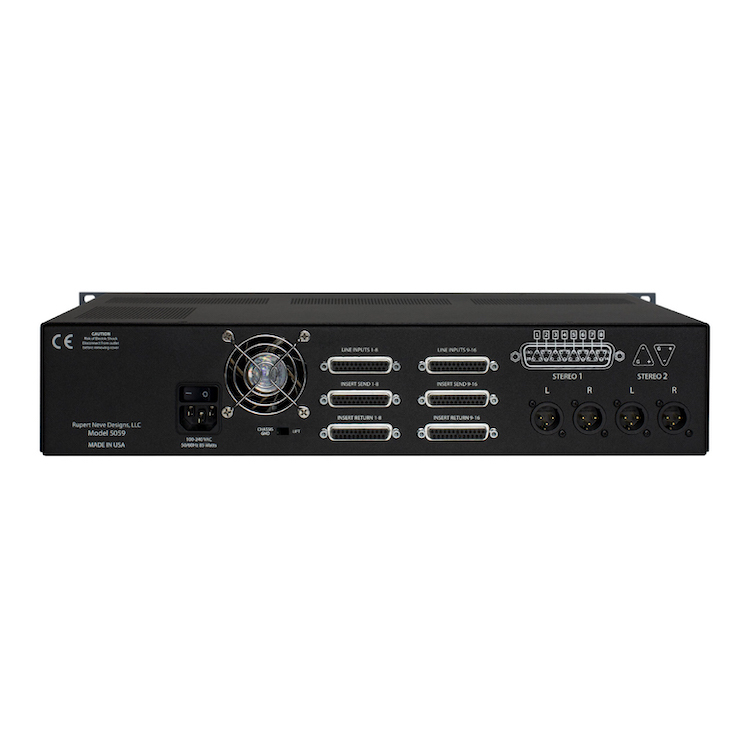 By connecting a second 5059 to the insert outputs of a 5059, the dual stereo outputs can be used as a way to add 4 auxes to each of the 16 channels. And when used with other products from Rupert Neve Designs’ summing family, the 5059 becomes an integral part of a complete modular system for world-class analog mixing and monitoring.