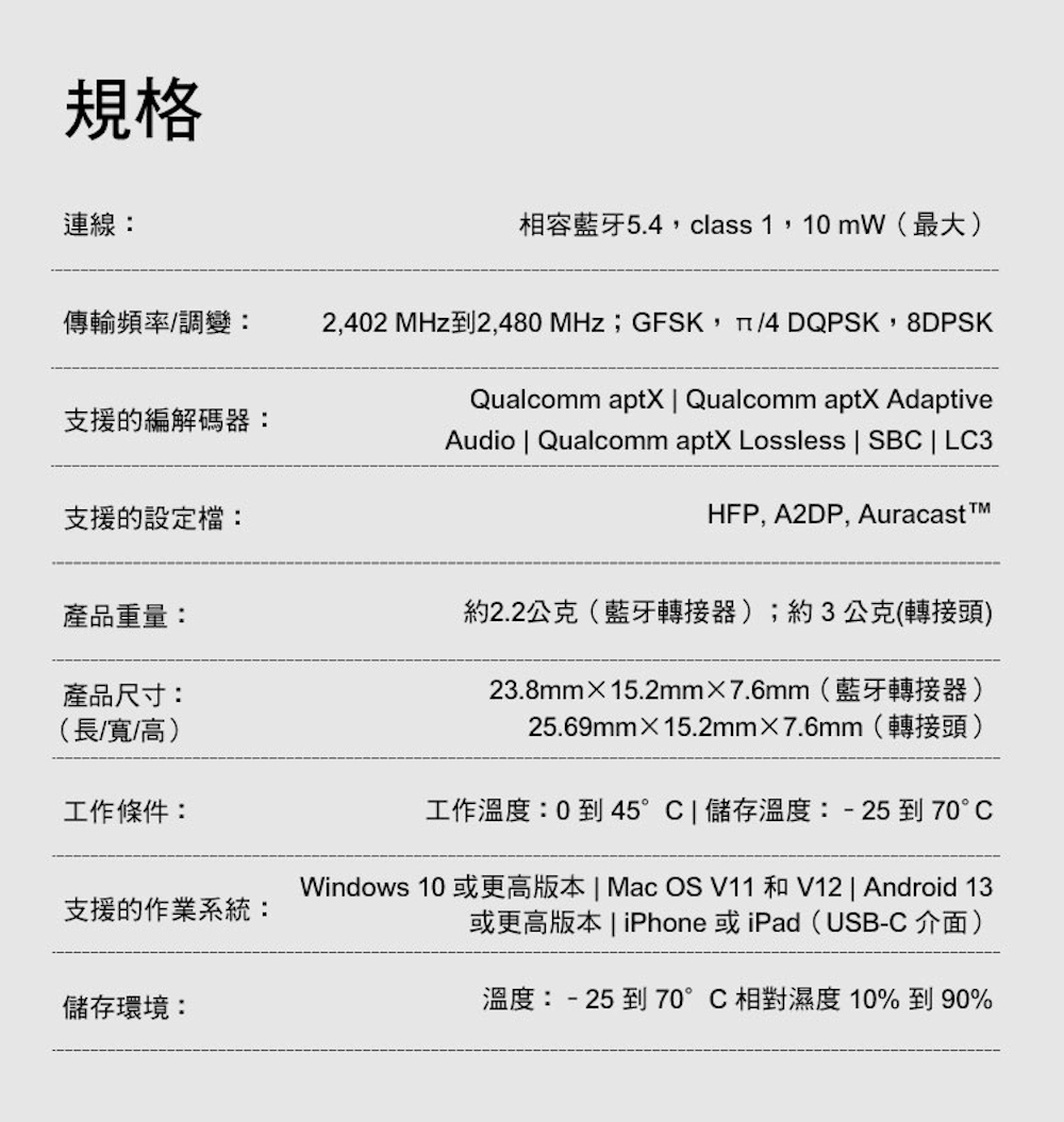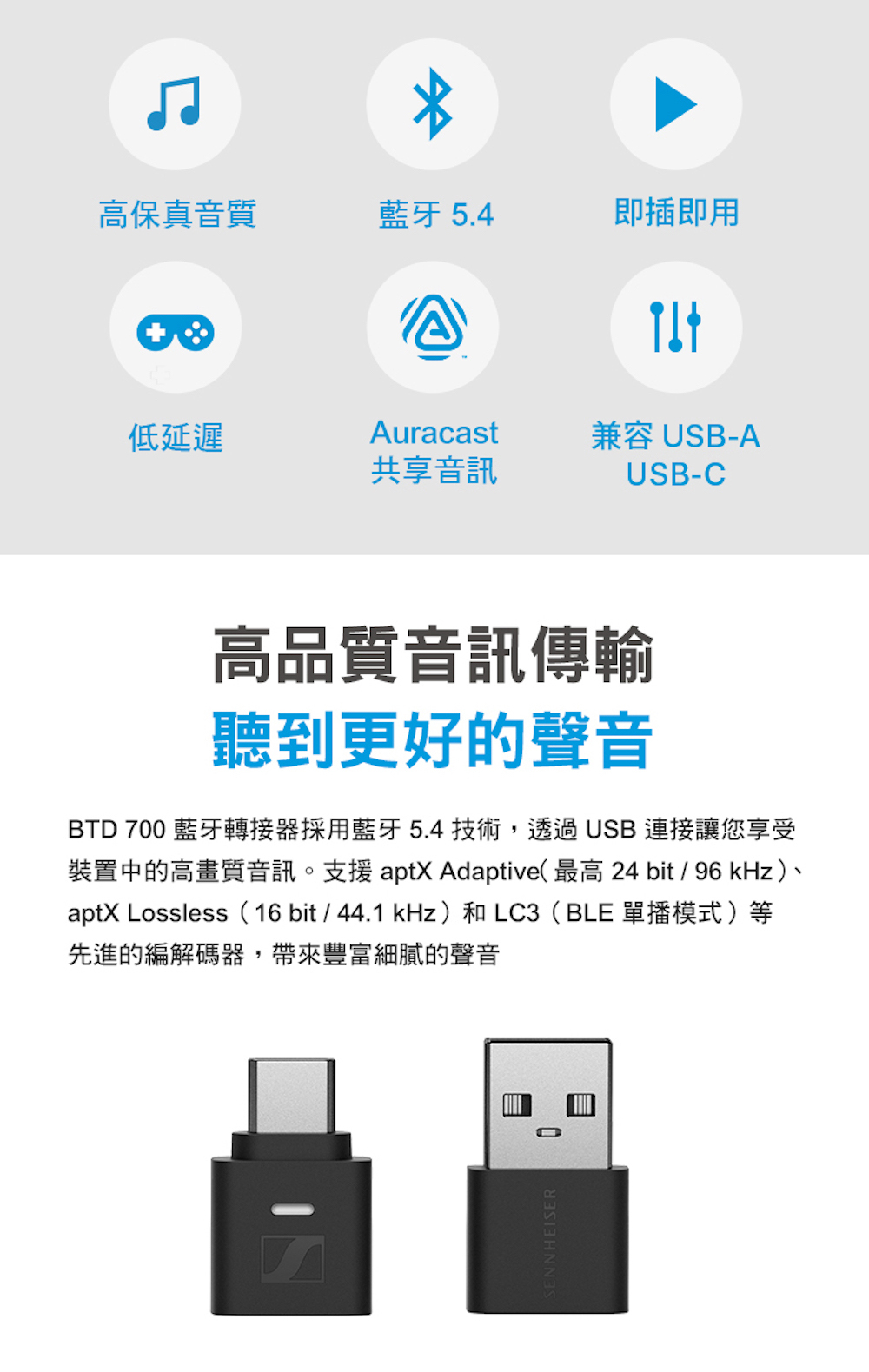 高解析音訊編解碼器,帶來無損藍牙音質 (最高 24-bit/96 kHz)
