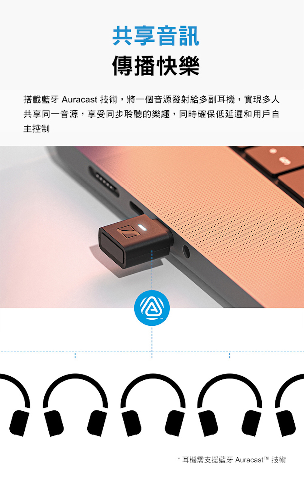 支援 Auracast™ 技術,可將音訊分享到多個支援 Auracast 的音訊設備