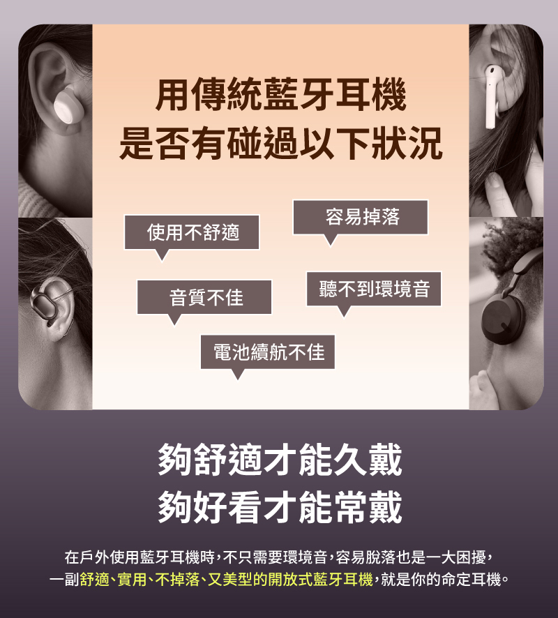 不對稱弧度設計 + 自帶 9g 夾緊力,不挑耳型都適配
