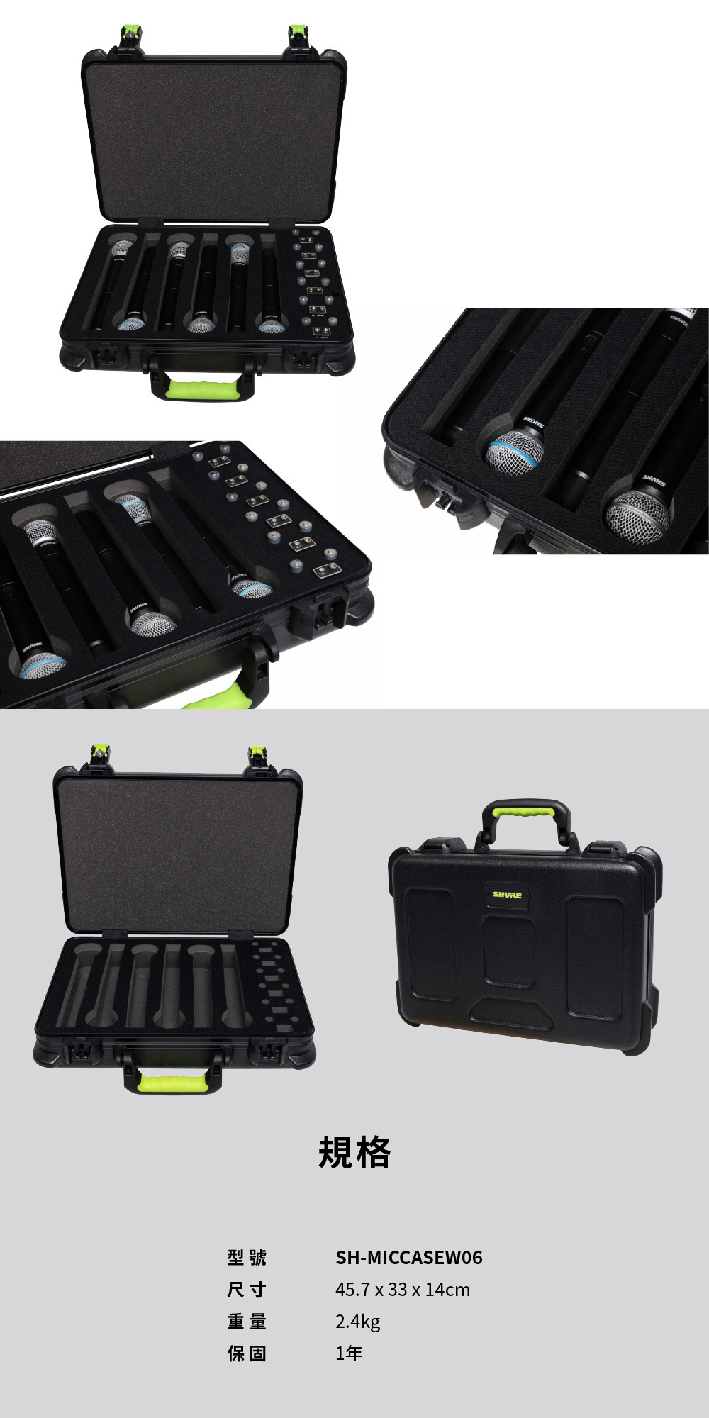 最多可容納 (6) 個 SHURE 或其他帶電池儲存的無線麥克風