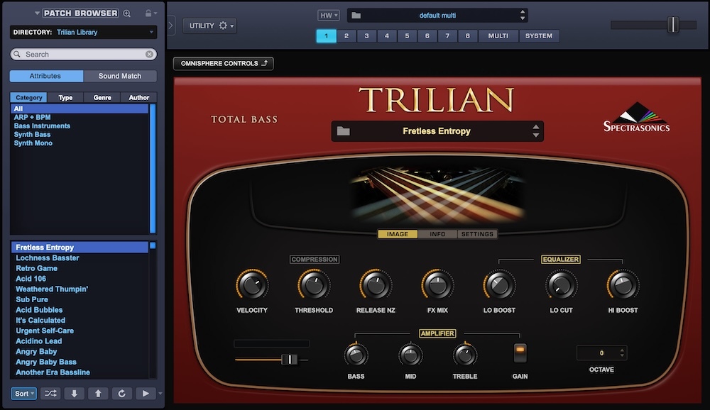 Trilian is the successor to Spectrasonics' award-winning Trilogy bass instrument, offering deeper control of musical expression and much greater flexibility of sound shaping. Trilian's 34GB library is 10-times the size of Trilogy and features all new acoustic, electric and synth basses the size of Trilogy. Over sixty different 4, 5, 6 and 8 string Electric basses are presented in fingered, picked, fretless, slapped, tapped, and muted technique variations. Version 1.5 has added many of Omnisphere's powerful synthesis functions as well.