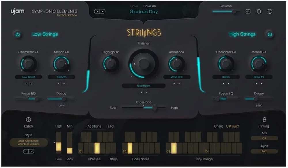 透過內建的 Finisher 與 Ambience FX 塑造你的聲音。你可以加入豐富的殘響、創意十足的動態效果,甚至使用實驗性的 Finisher 預設,將弦樂徹底轉化,突破傳統管弦樂音色的界限。