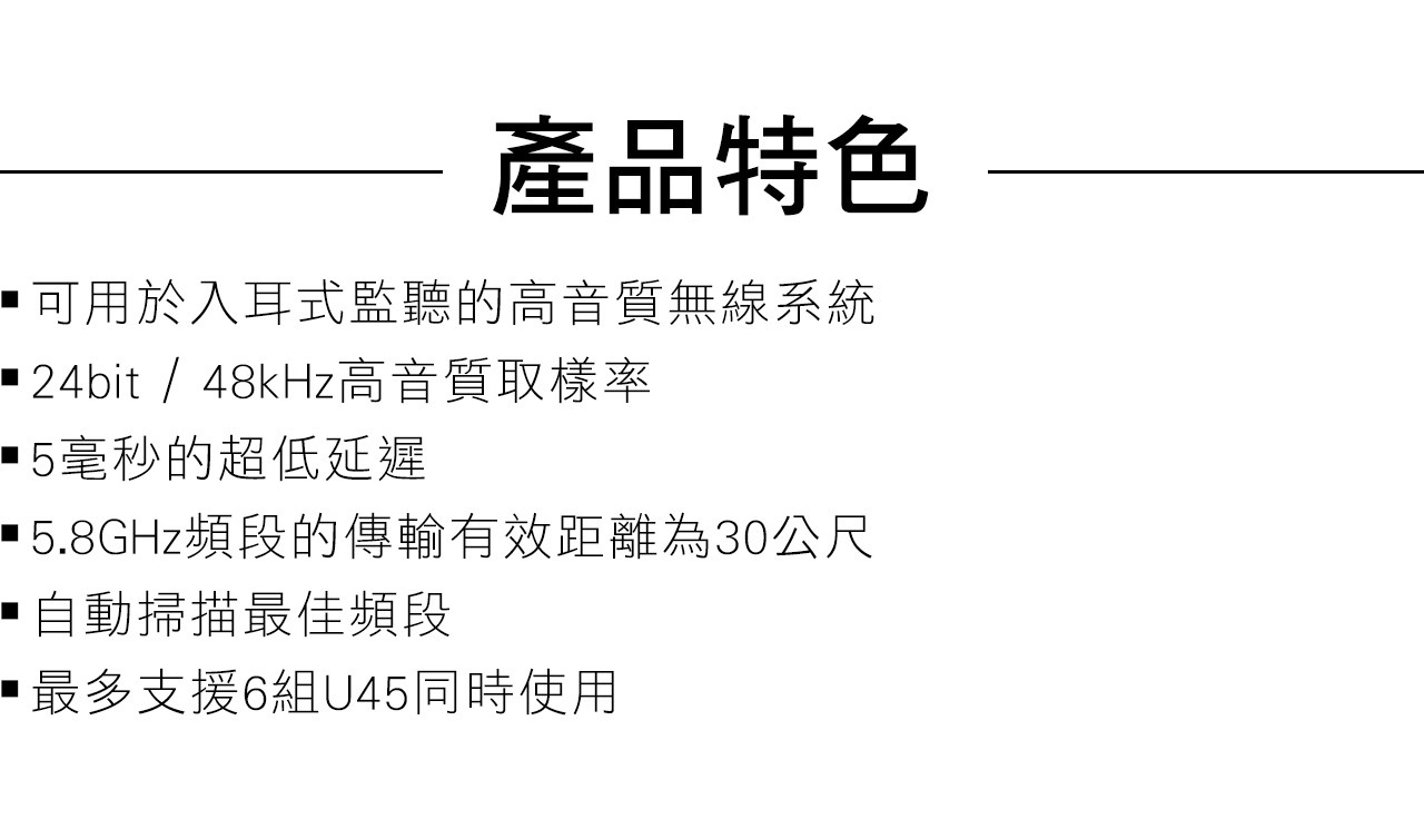最多可同時使用 6 組 U45 系統,團隊成員可各自擁有專屬耳機監聽